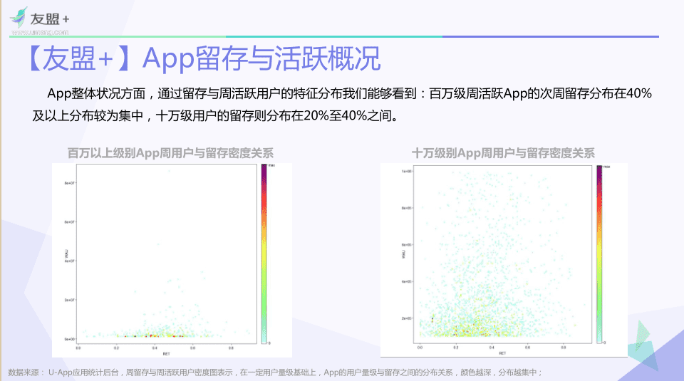 • App的次周留存密度不周用户体量有一定关联,用户量级越大,留存的集中密度于偏高水平。