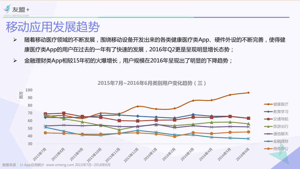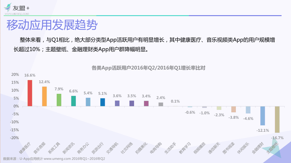 • 不同应用类型使用上,拍摄美化、视频播放等类活跃用户规模过去一年内较为稳定,健康医疗类呈现明显增长态势,金融理财、主题壁纸类应用持续走低。