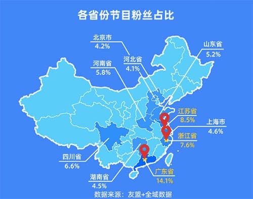 广东、江苏、浙江的忠诚粉丝最多,分别占比14.1% 、 8.5% 、 7.6%