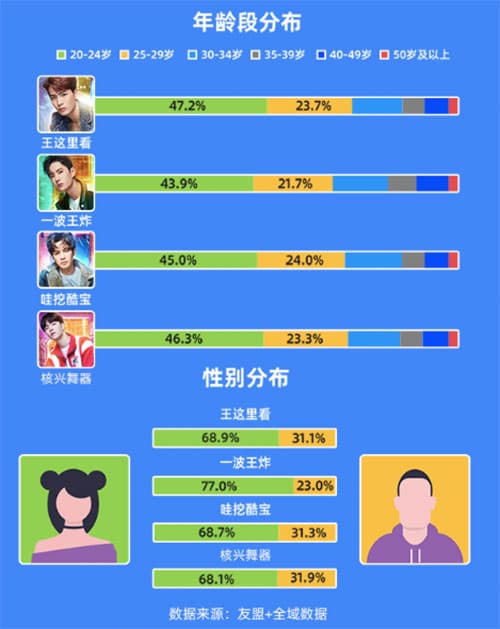 据友盟+全域数据显示:四大战队中,王嘉尔的“王这里看”年轻观众最多,王一博的“一波王炸”最受“这街女孩”青睐,钟汉良的“哇挖酷宝”收获了大量年轻粉丝,张艺兴的“核兴舞器”则覆盖全年龄的观众。