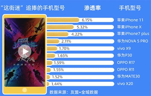 这街迷追捧的手机中:苹果“风骚”,华为“紧追”,VIVO “ 紧随其后”: 苹果用户依然“喜新厌旧“,热衷最新机型,iPhone11是最爱。相反华为用户更追求性价比,NOVA 5 PRO最受喜欢,vivo X9的柔光自拍也颇受欢迎。