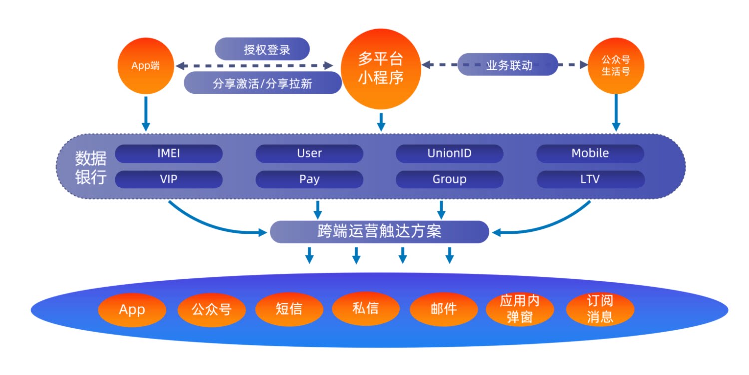 比如,App端可以通过微信、QQ或者支付宝的授权登录端口完成登录以后,小程序数据就可以与App用户发生数据关联。这样小程序用户的用户行为习惯就可以跟App用户的行为标签进行关联。同时,从 App 端分享的内容以小程序的形式发到各类社交平台上,又反向关联了其他平台小程序用户的行为数据。