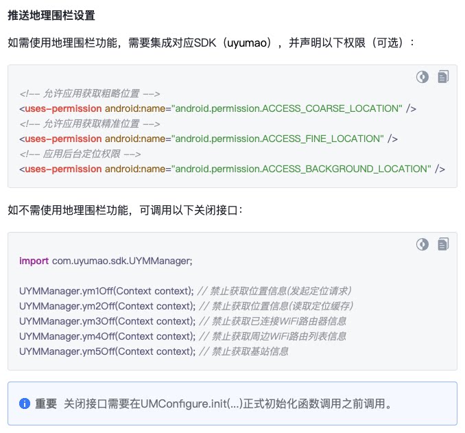 确认地理围栏功能设置正确,并申请相应权限 https://developer.umeng.com/docs/67966/detail/98583#ba7f004014yge