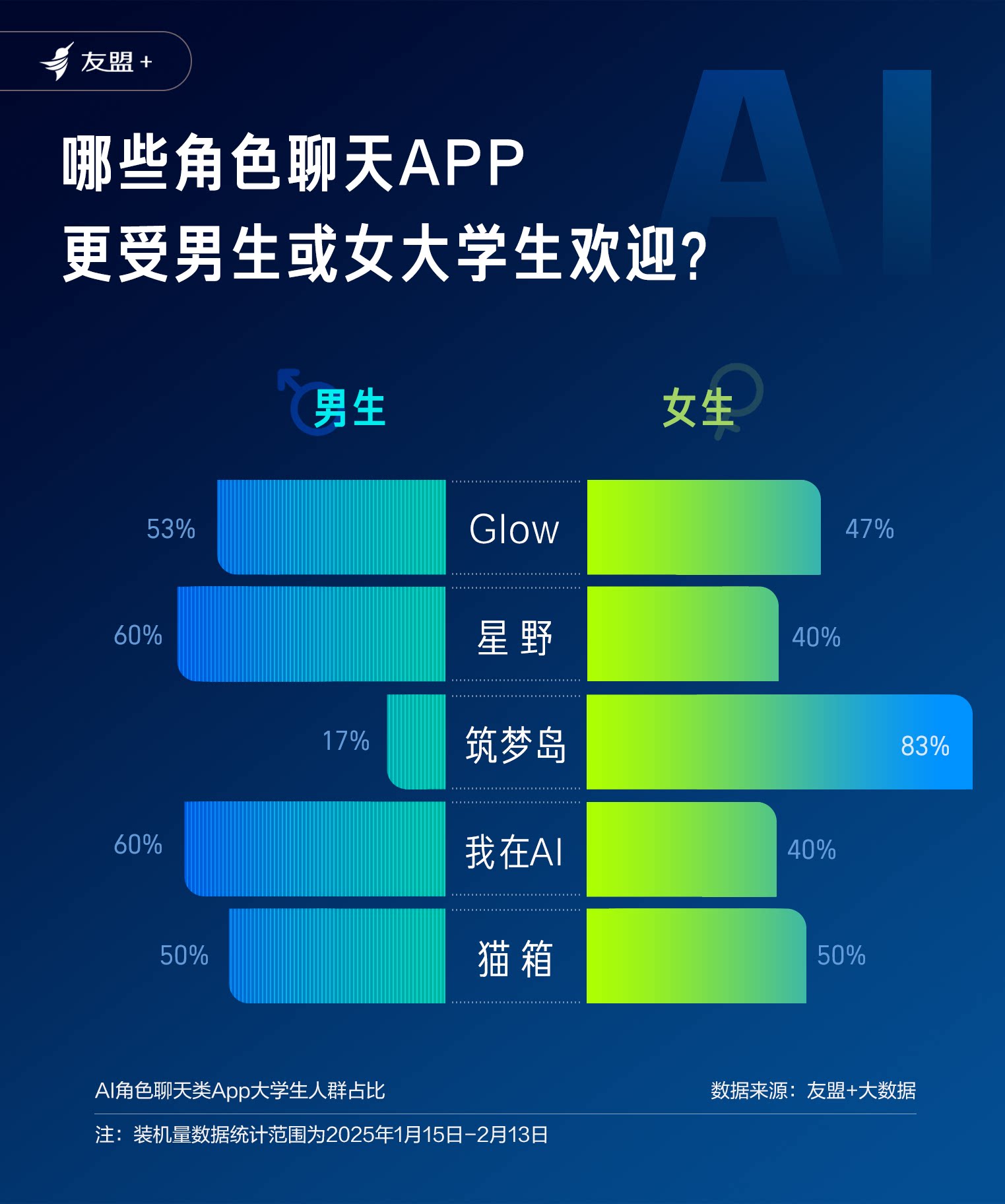 角色聊天APP中,女生为筑梦岛的治愈系AI男友豪掷时间,星野、我在AI 双双斩获60%男生。Glow、猫箱等APP成为“新型社交”——有人在这里培养虚拟知己,有人训练AI玩角色扮演。这届大学生用实际行动证明:与AI谈恋爱,比现实更香。