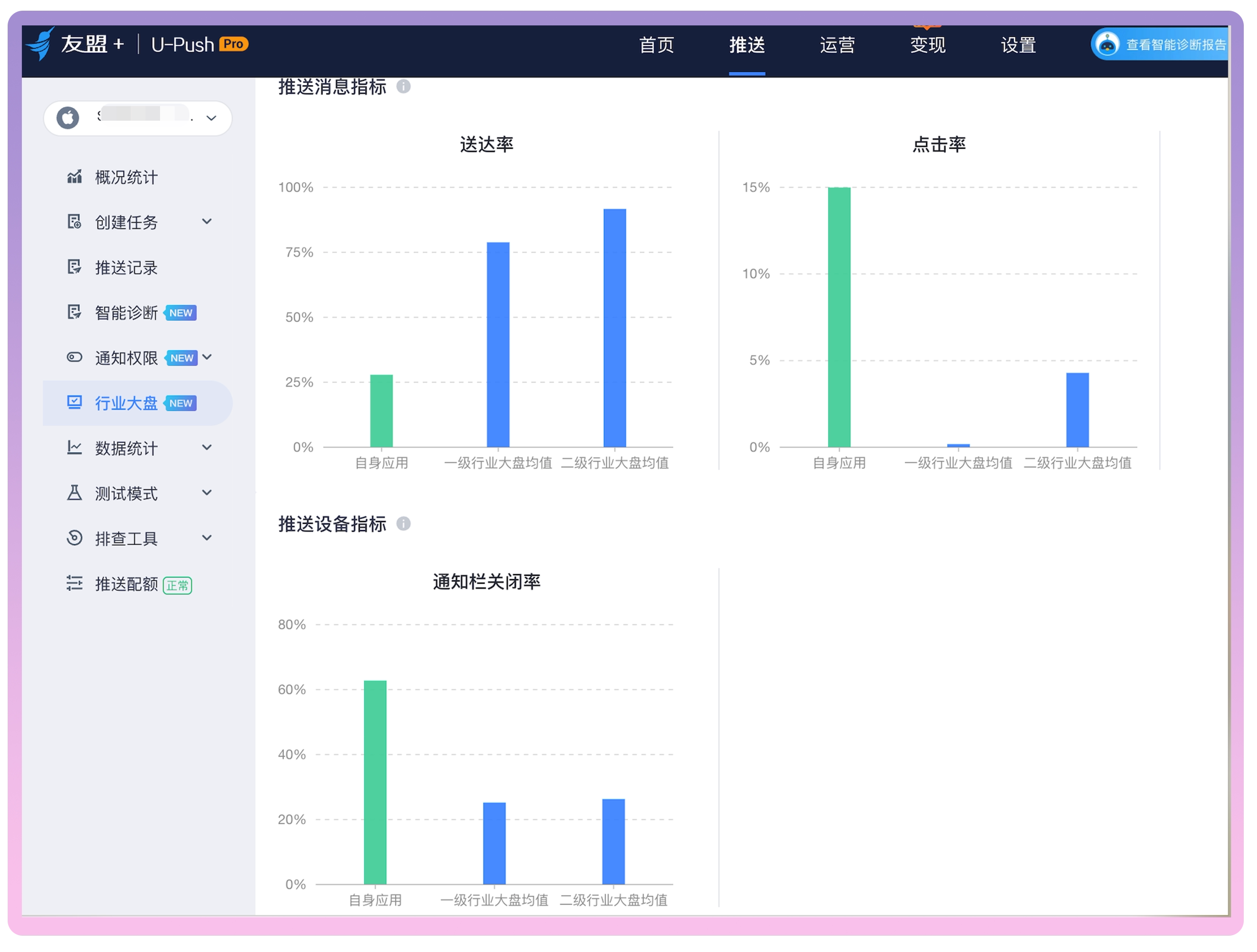 为帮助您全面评估推送效果,U-Push 在iOS端新增行业大盘对比能力。通过该功能,您可以:
