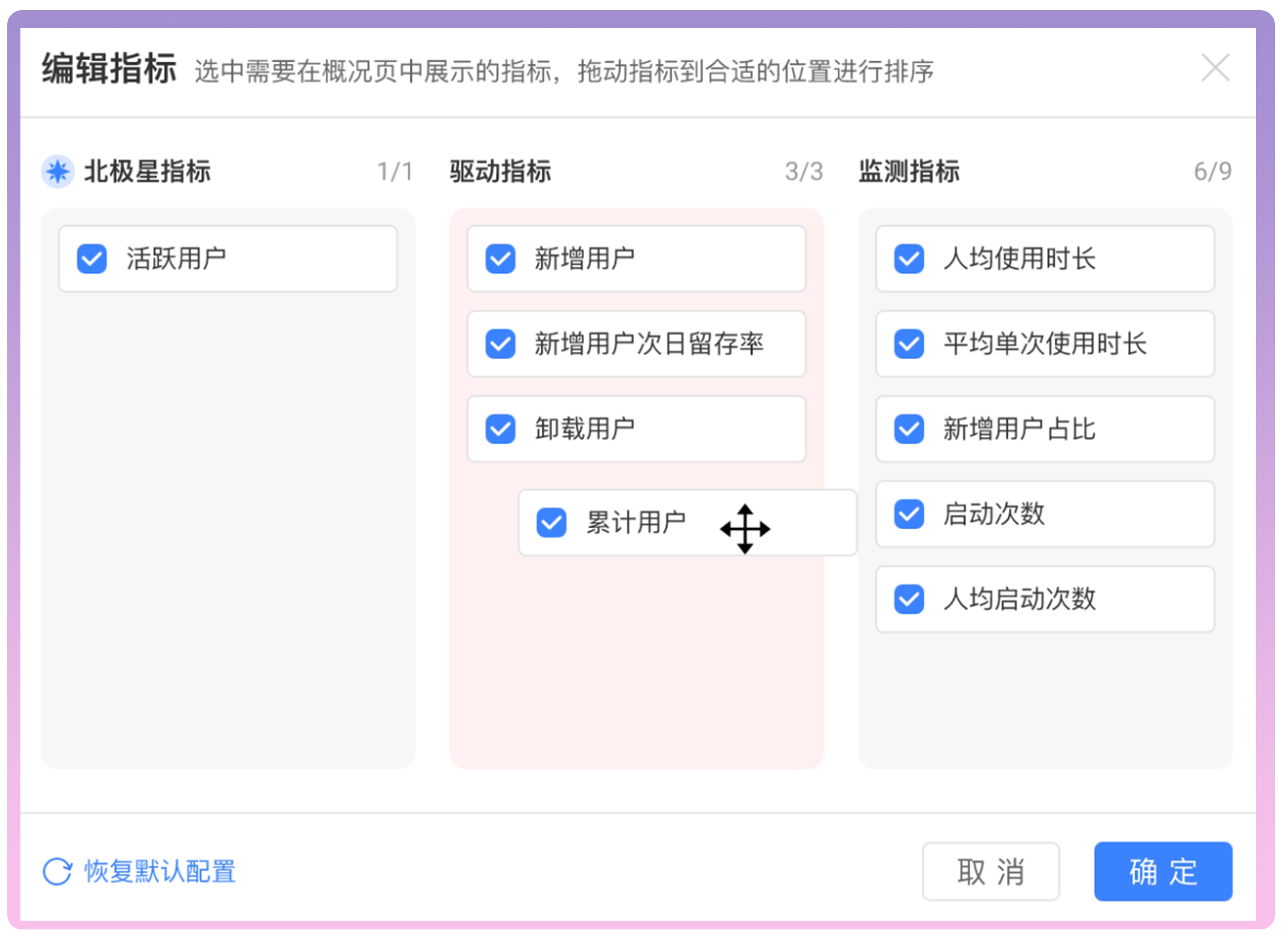 支持拖拽排序、指标编辑,自由调整看板上各项数据的布局与展示,以满足不同角色(如管理、运营、产品等)对数据关注点的差异化需求。
