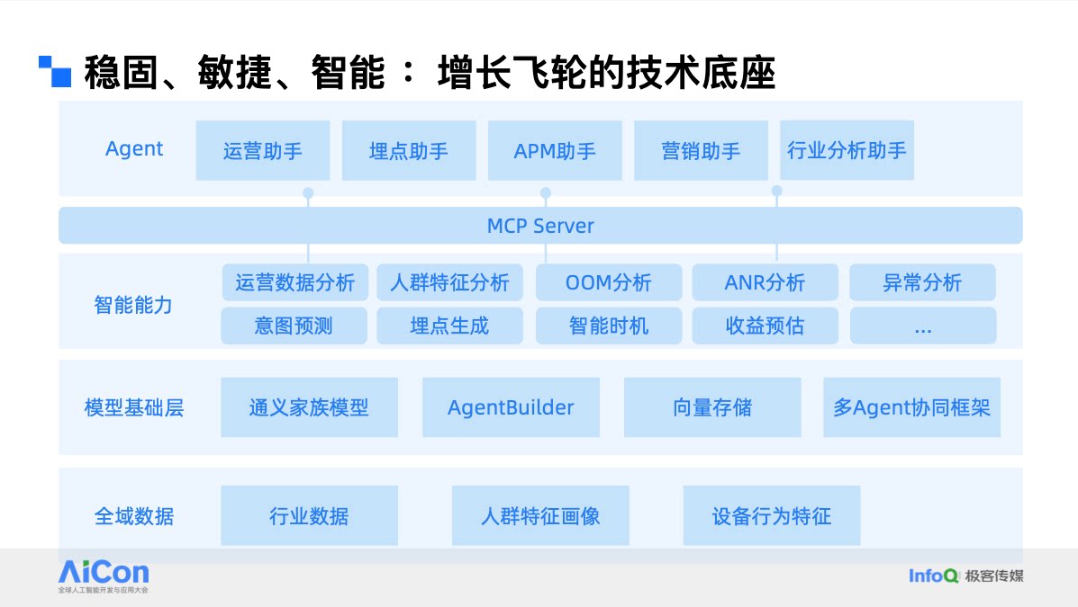 2025年8月23日,在AICon全球人工智能开发与应用大会上,友盟+产品总监冯成蹊发表了题为《当AI Agent成为营销新引擎,破解流量困局与ROI迷局》的主题演讲。他深入剖析了当前营销市场中广告主与广告媒体面临的流量困境与ROI提升挑战,并系统阐述了AI Agent作为新一代营销引擎的核心价值与应用路径,为从业者提供了前瞻性的思路与切实可行的方法指引,助力其在复杂的广告环境中实现突破。